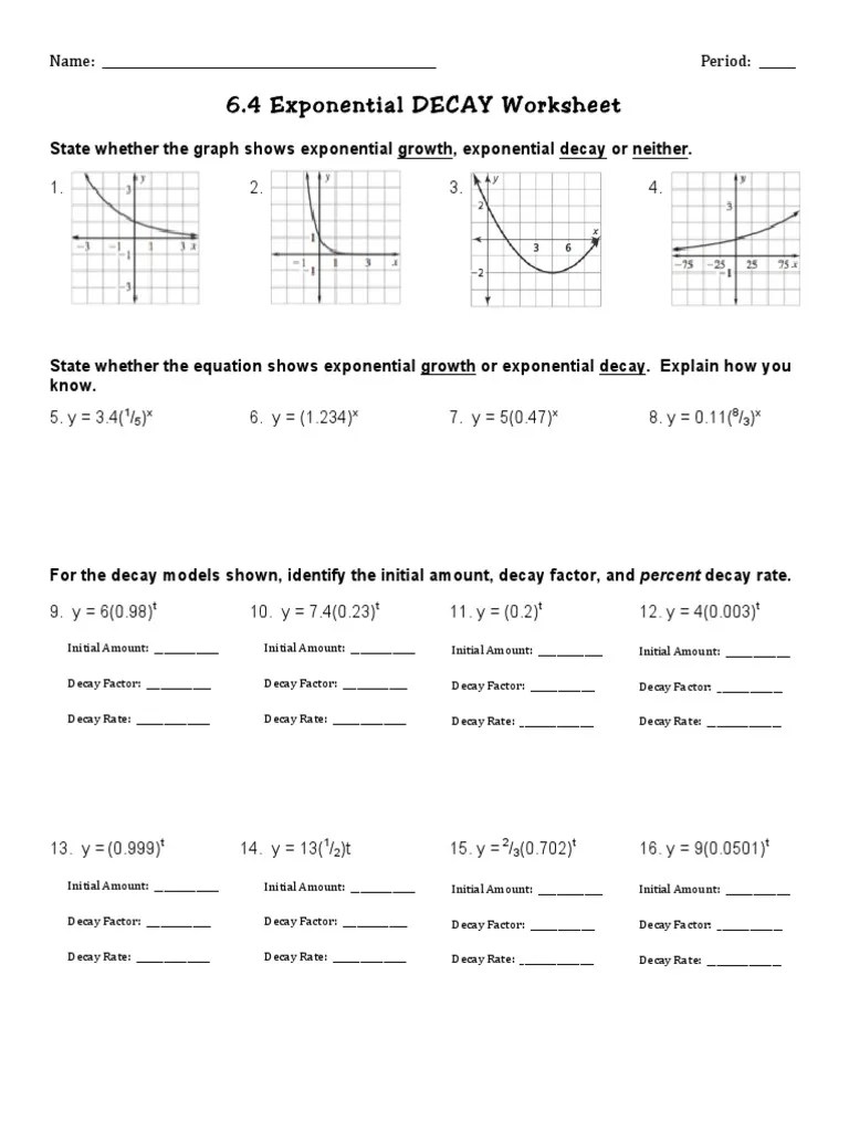 I can graph parent exponential functions and describe and graph f exponential functions. Here we will learn about exponential graphs, including recognising, sketching, plotting and interpreting exponential graphs. Round your answer to the nearest dollar. Identifying exponential growth and decay determine whether each table represents an exponential growth function, an exponential decay function, or neither. For exponential decay, the value inside the parentheses is less than 1 because r is subtracted from 1. I can write equations for graphs of exponential functions. From population growth and continuously compounded interest to … Write an exponential decay function to represent this situation. ©v k2u0y1 r23 xktu ntla q vsso4f vtuweamrnew ylylpcf.l g ia wl wll 4r ci9g 1h6t hsi qr feks 2e vrhv we3d9. The function y = 3x is called an _____ function because the exponent is a now, let's look at how to graph the exponential function y = 3x. Xy 0 270 190 230 310 b. Radioactive decay is an example of exponential decay. Exponential growth and decay show up in a host of natural applications.
